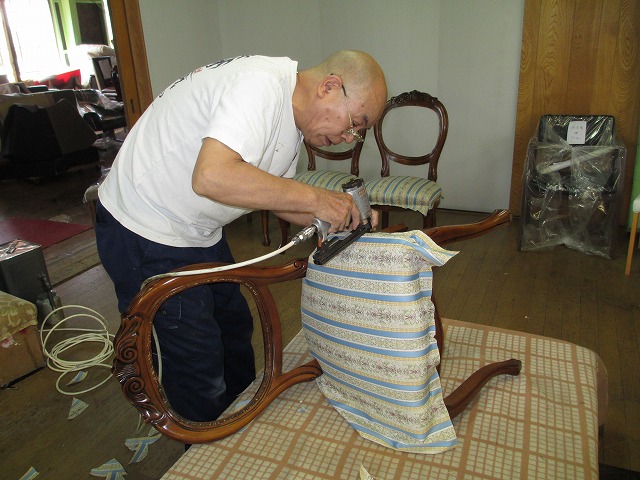 ダイニングチェアーの張替です。 ここからまず、生地を剥していきます。
