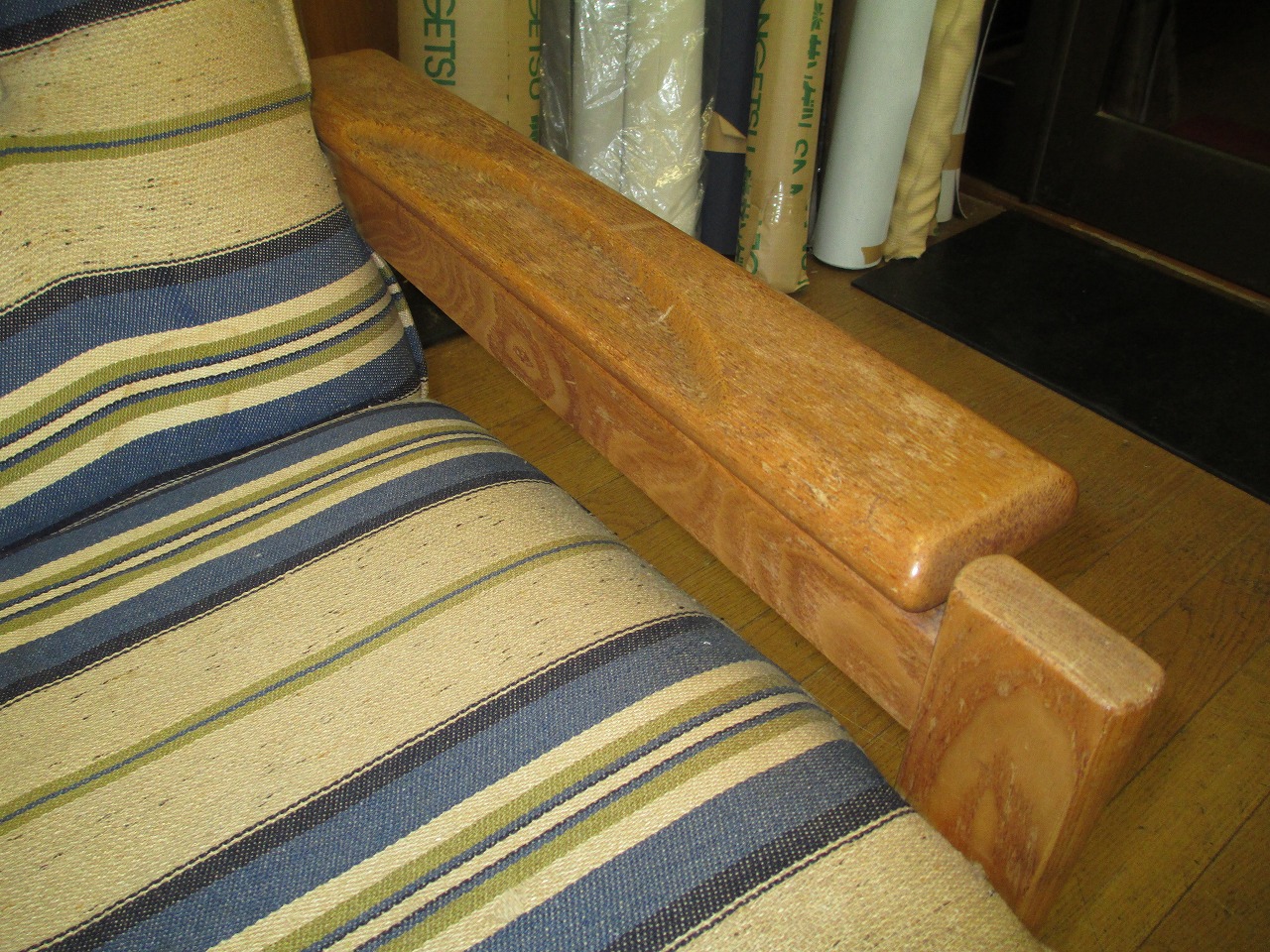 ソファー張替え、塗装になります。 ここから座を外し木部は塗装、座面は張替えをします。