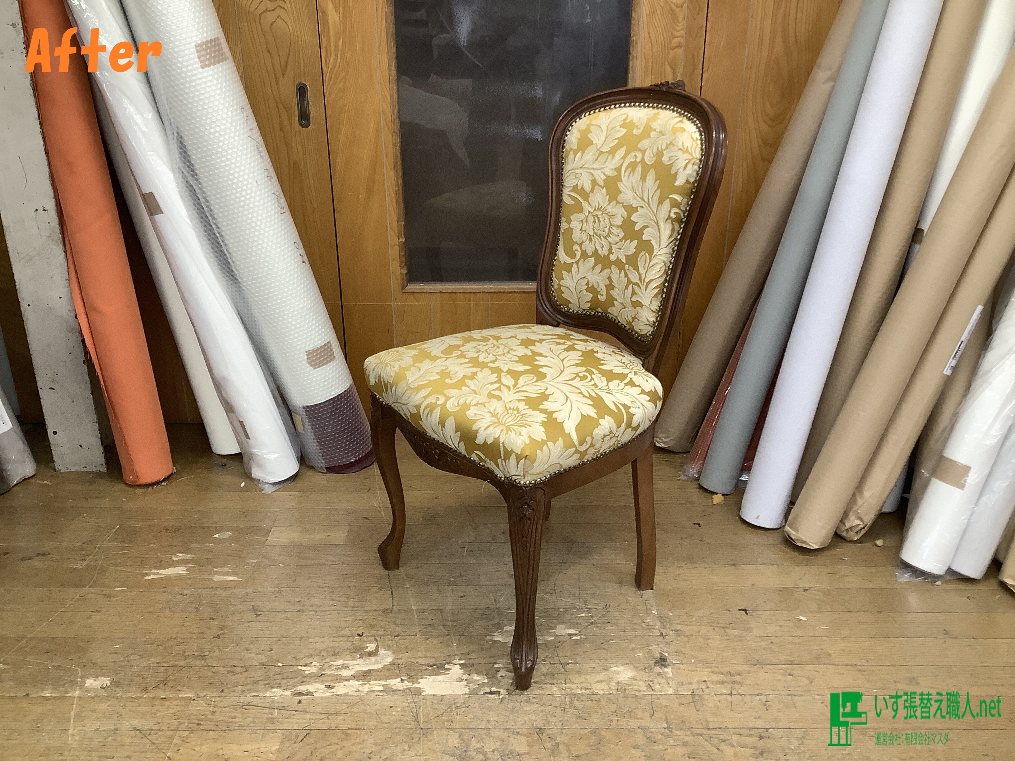 クラシックチェア張替え後です♪ 生地は、サンゲツ、ジャパネスクロマン(布)の黄色系になります。