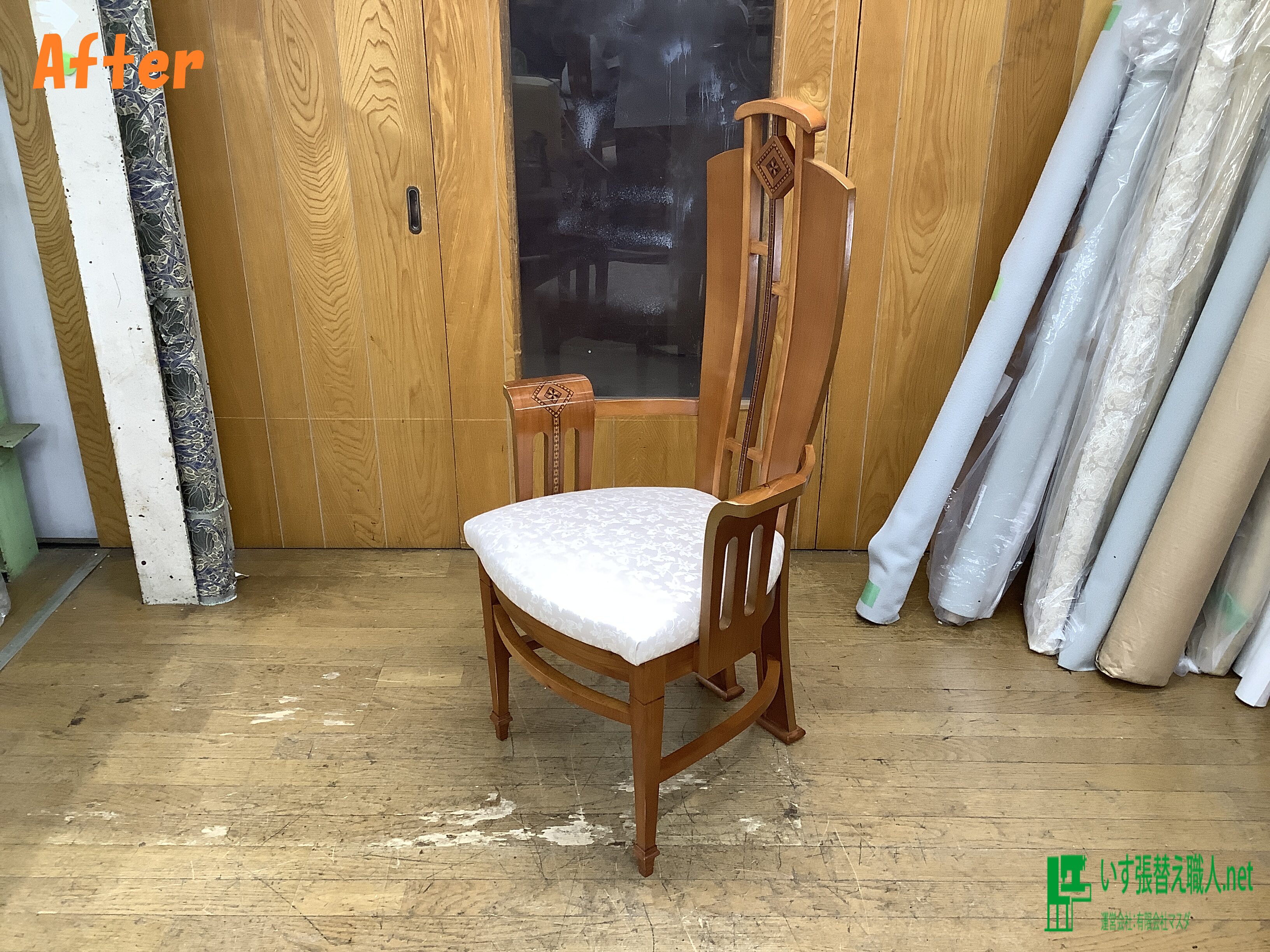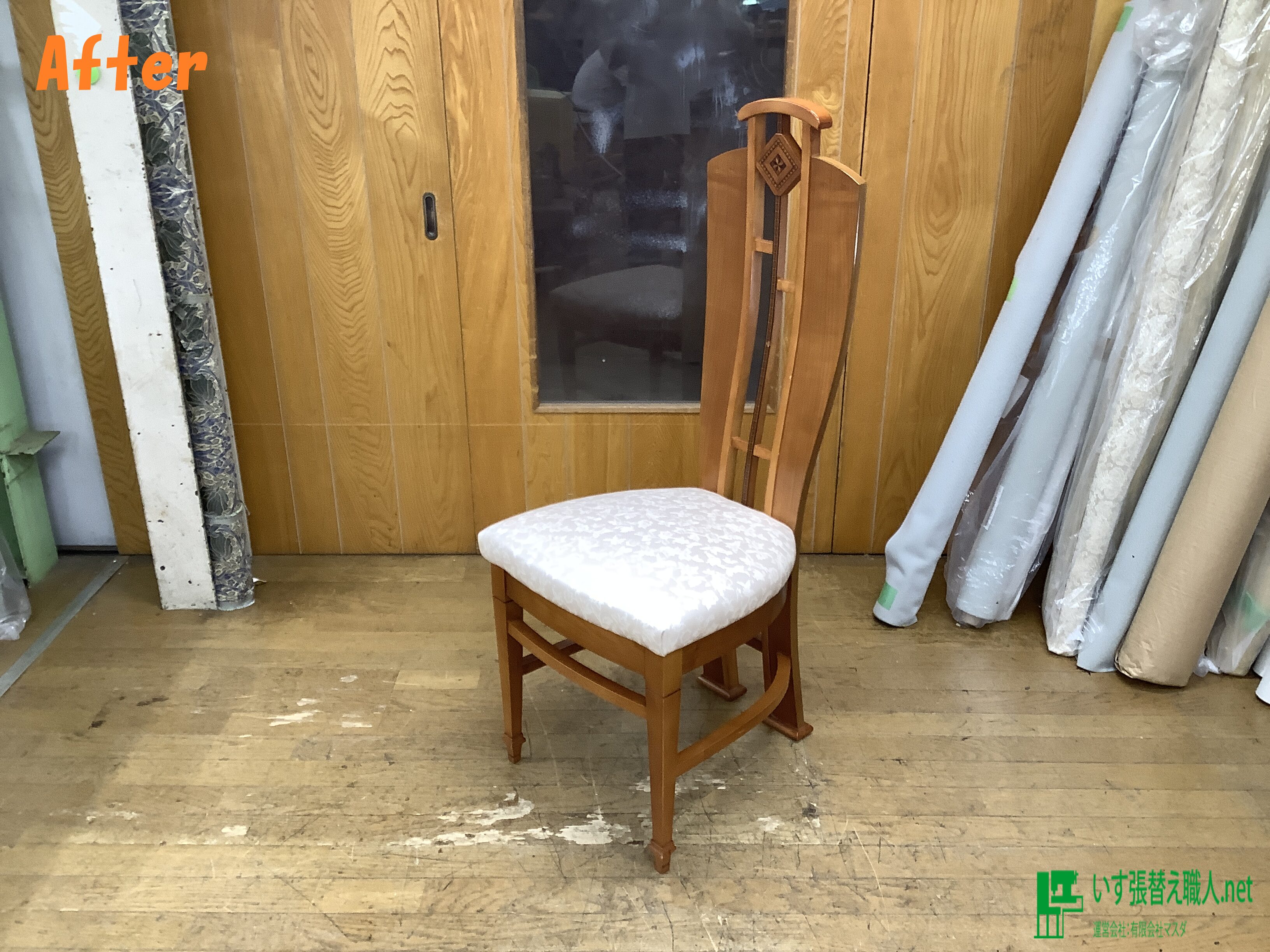 ダイニングチェア張替え後です♪ 生地は、サンゲツ、クラシカルブーケ(合皮)の白系になります。