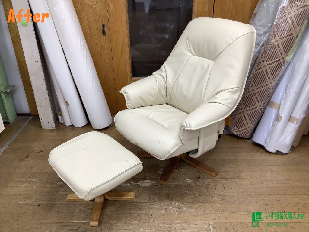 リクライニングチェア・オットマン張替え後です♪ 生地は、メルセン、デコラス・T(革)のアイボリー系になります。