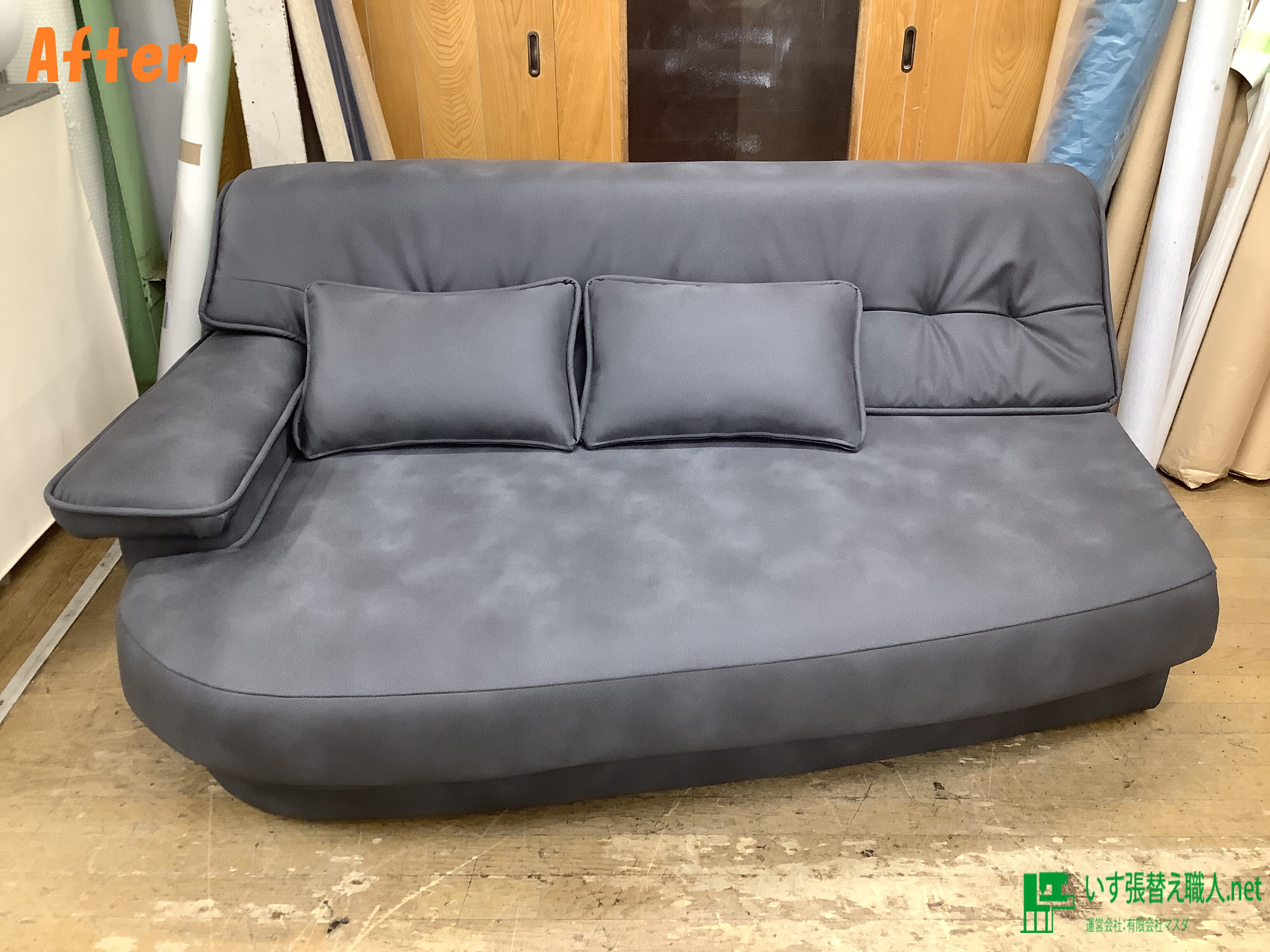 3人掛けソファ張替え後です♪ 生地は、シンコール、ビガプリモ(合皮)のグレー系になります。