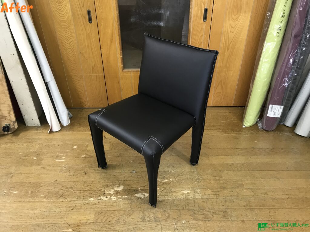 ダイニングチェア張替え後です♪ 生地は、メルセン、ボスブライト(革)黒系になります。