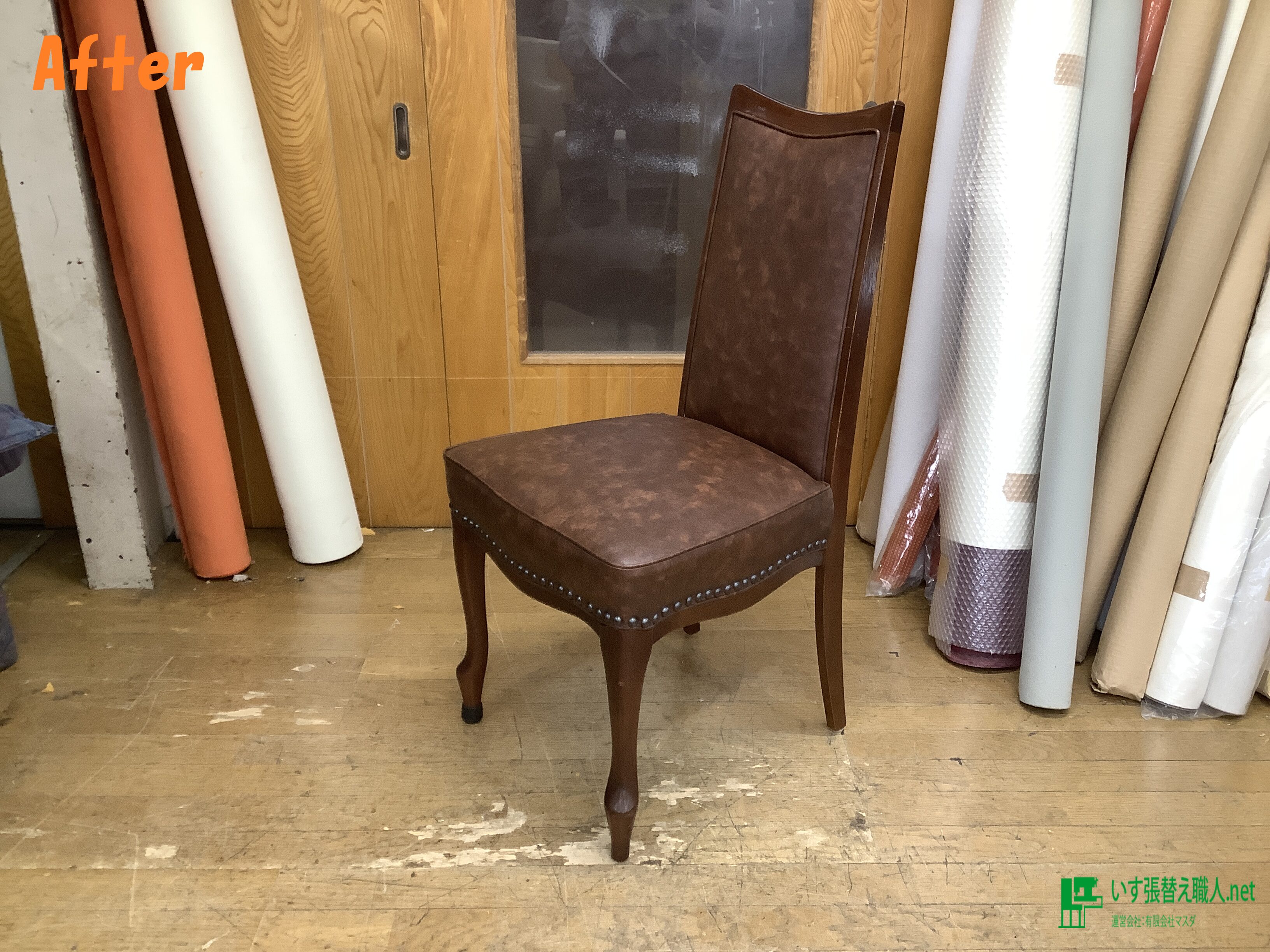 マルニ社製ベルサイユチェア張替え後です♪ 生地は、シンコール、ノスタルジャン(合皮)の茶系になります。